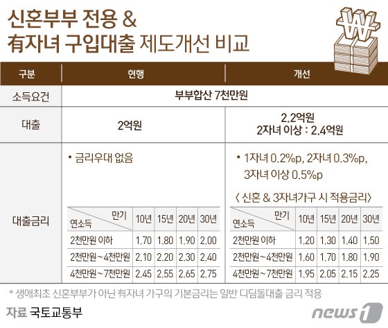 신혼부부가 첫 주택담보대출을 이용해 내 집을 구입하려면 몇 가지 조건을 충족해야 한다. 우선 2024년 기준 자산 규모(금융/자동차/리스보증금 등)가 4억6900만원 미만이어야 한다. 소득요건도 있다. 부부의 연소득이 8,500만원 이하여야 합니다. 참고로 세전소득입니다. 신혼부부의 조건은 혼인기간 7년 미만으로 제한되며, 신혼부부도 생애 첫 주택담보대출을 이용할 수 있으니 참고하시기 바랍니다. 단, 혼인은 3개월 이내에 이루어져야 하며, 추후 혼인신고를 통해 증빙을 제공합니다. 물론, 대출을 신청하려면 가구 구성원 모두가 노숙자여야 합니다. 최초 주택담보대출 조건 2 구입하려는 주택의 제한 사항을 충족하는 경우에만 최초 주택 대출을 받을 수 있습니다. 세부 조건은 주거면적 85㎡ 이하, 주택가격 6억원 이하다. 현실적으로 서울에서는 아주 작은 집이다. 아파트나 빌라가 아닌 이상, 생애 처음으로 내 집을 구입하는 것은 다소 어려울 수 있습니다. 현실적으로 대출을 이용하려면 수도권 밖으로 나가야 한다. 요즘은 85㎡ 아파트를 짓지 않는 이상 6억 원 이하의 가격에 찾기 힘들다. 신축 아파트에 집을 사고 싶다면 수도권에서는 주택담보대출을 이용해 저금리로 대출을 받기가 쉽지 않다. 물론 집의 크기를 20평으로 줄이면 선택의 폭은 다소 넓어진다. 최초 주택담보대출 한도 : 최초 주택담보대출의 대출한도는 다소 넉넉하다고 할 수 있습니다. 한도는 4억원이다. DTI/LTV는 각각 60%, 80%가 적용됩니다. 최초 주택담보대출 금리 최초 주택담보대출 금리는 기준금리가 2~3% 정도입니다. 이 금리도 시중은행의 주택담보대출 금리와 비교하면 매우 매력적이다. 다만, 여기에는 추가 우대금리가 적용될 수 있습니다. (우대금리 조건) 가입기간에 따라 최대 0.5%, 다자녀 최대 0.7%, 전자계약, 신규판매 등 조건 충족시 가산됩니다. 0.2%… 모든 우대금리를 최고금리로 적용할 경우 총 1.4%의 금리가 차감됩니다. 첫 주택담보대출 평균 기본금리를 기준으로 1% 중후반대의 낮은 금리로 주택담보대출을 받으실 수 있습니다. (우대금리를 모두 적용한 후 최저금리는 1.2%입니다.) 첫 주택담보대출을 활용하기 위한 소득 및 자산 조건을 충족한다면 신혼부부에게는 금융비용을 대폭 낮출 수 있는 기회가 될 것입니다. 이미 결혼한 신혼부부이거나 결혼을 계획하고 있는 신혼부부라면 주택 구입 시 참고하시기 바랍니다.