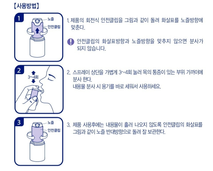 인후스프레이 사용법 : 1회 사용시 스프레이 윗부분을 3~4회 가볍게 누른 후 숨을 내쉬며 아픈 목 부위에 분사, 1일 3~5회 사용합니다. 저도 새관으로 고생할 때 제일 중요한건 목을 꾹꾹 눌러주는 것! 뿌리면 시원하고 항염도 엄청 빨라요.