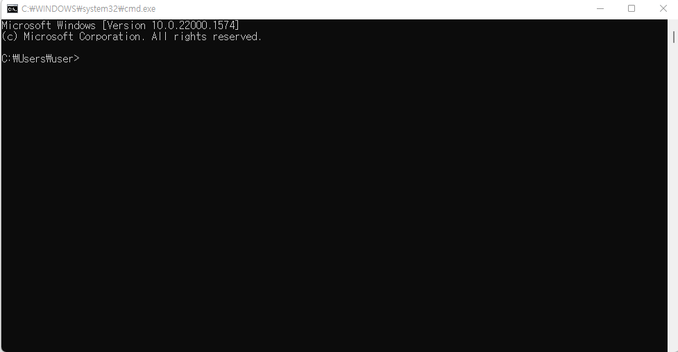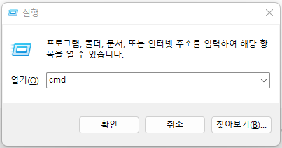 Win(Windows 키) + R을 누르고 실행 창에 cmd를 입력합니다.