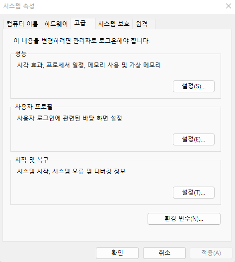 고급 시스템 설정을 클릭합니다. 고급 시스템 설정을 클릭하는 버튼이 즉시 나타나지 않으면 설정 검색 표시줄에서 고급 시스템 설정 표시를 찾으십시오. 그리고 클릭하면 아래와 같은 창이 뜹니다.