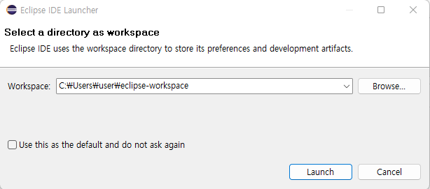 워크스페이스 경로(추후 변경 예정)를 확인한 후 Launch를 실행합니다.