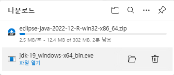 그리고 다운로드를 클릭하면 오른쪽과 같이 다운로드가 시작됩니다. 파일을 열거나 저장하라는 메시지가 표시되면 저장을 선택합니다. 다운로드가 완료되면 파일의 압축을 풀고 elipse 폴더를 선택합니다.